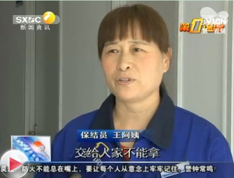 保洁员阿姨正在接受西安电视台记者的采访