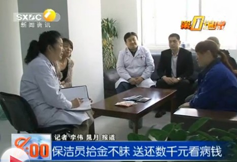 在二楼候诊区,院领导亲自将钱包送还给我。我打开查点分文未少,心里特别激动,当即掏出1千元钱准备感谢保洁员阿姨,被院领导和保洁员阿姨婉言谢绝了,说这是他们应该做的。我觉得这位保洁员的拾金不昧精神特别可嘉,难能可贵!”