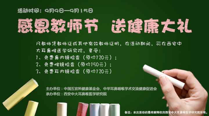 活动期间凭教师证或其他有效教师证明,在西安中大耳鼻喉医院可免费享受原价150元的喉镜检查原价120元的鼻内镜检查以及原价120元的耳内镜检查