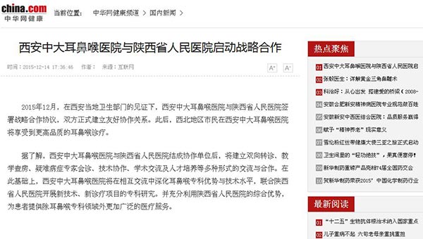 【中华网】西安中大耳鼻喉医院与陕西省医院启动战略合作